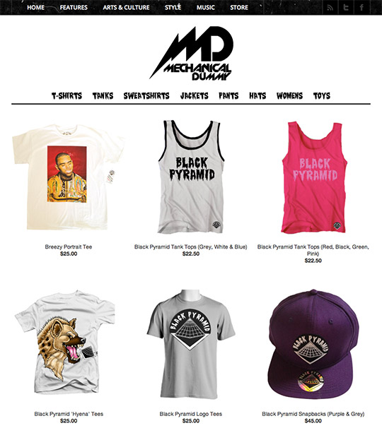 This week we relaunched the shop for Chris Brown’s clothing line, Mechanical Dummy. The previous shop was a chaotic mess, and our task was to clean it up and simplify. I kind of wish I remembered to take a screenshot of the previous look to compare, but I did not. So you’ll have to take my word for it. It’s much cleaner and easier now. (Success!)
