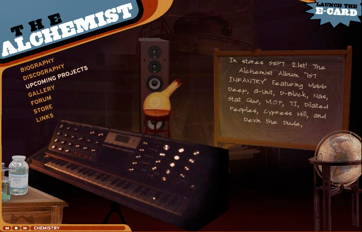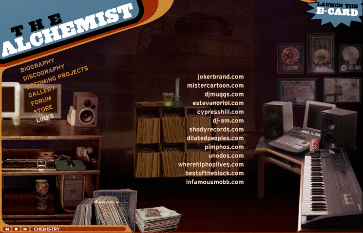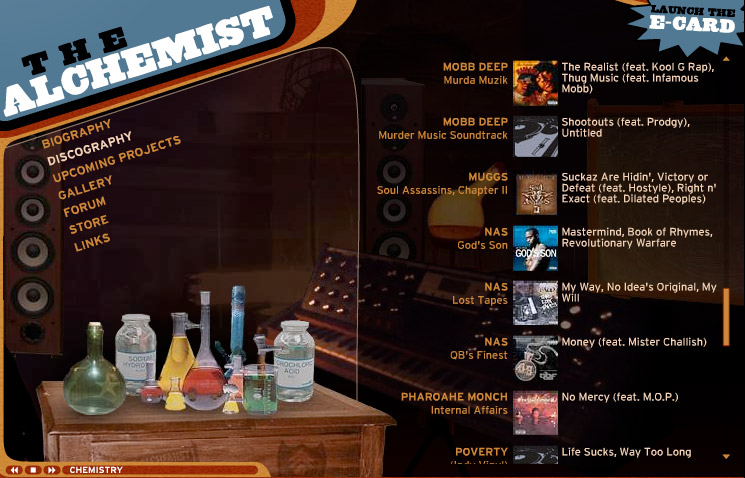This was a fun Flash site for hip-hop producer Alchemist. It featured horizontal parallax scroll through his studio, where the content emerged from items in the room. It included a custom-built CMS.