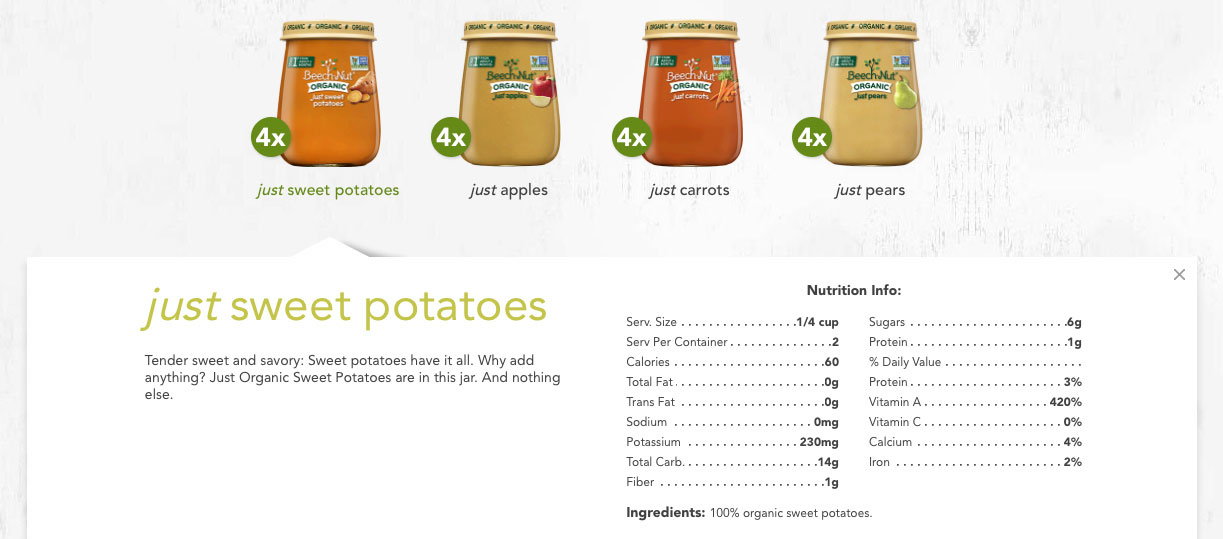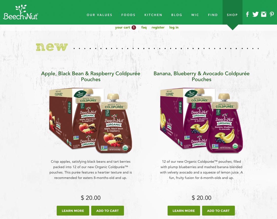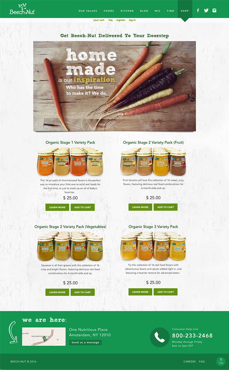 We developed the official e-commerce site for Beech-Nut baby foods. Our task was to design the shop so it fit in with the existing style of their website.