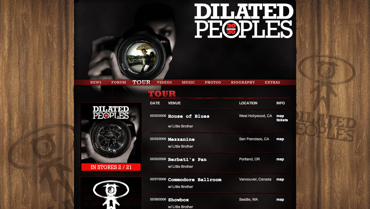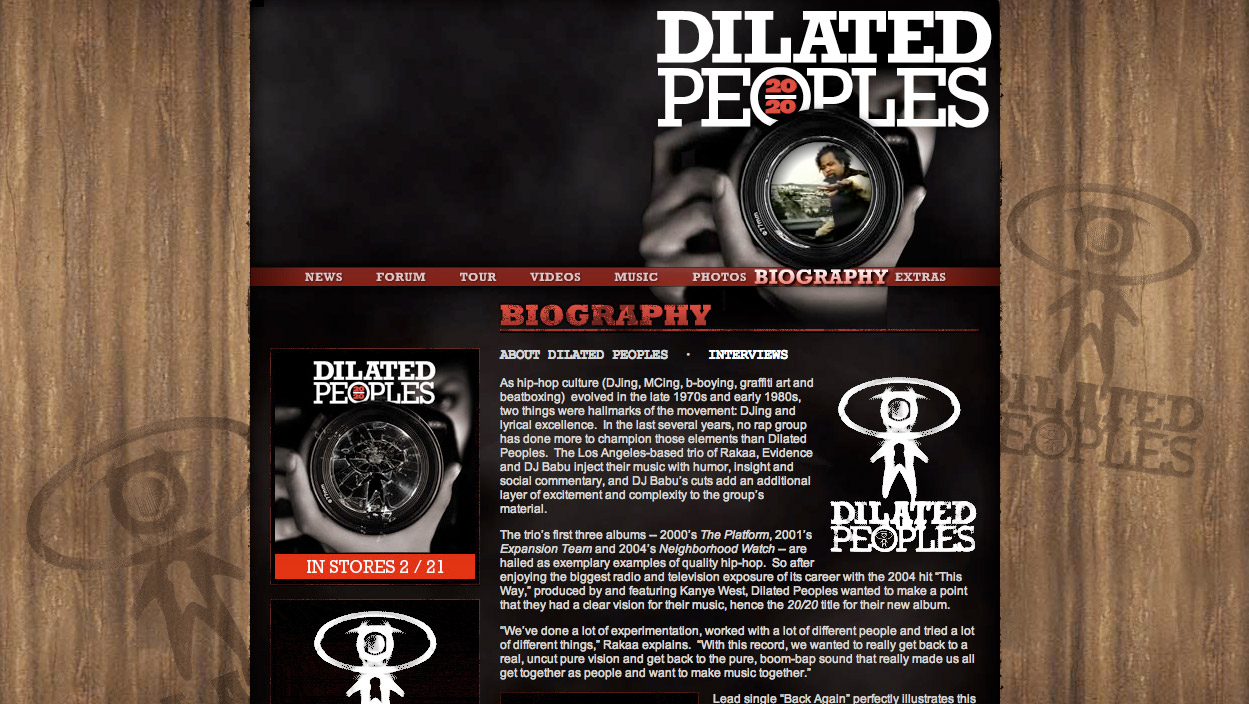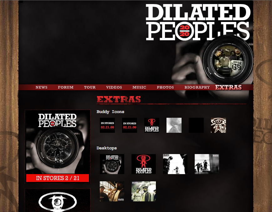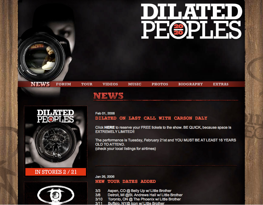 This was the official Dilated Peoples website, promoting their album 20/20. We handled the design and Flash animation.