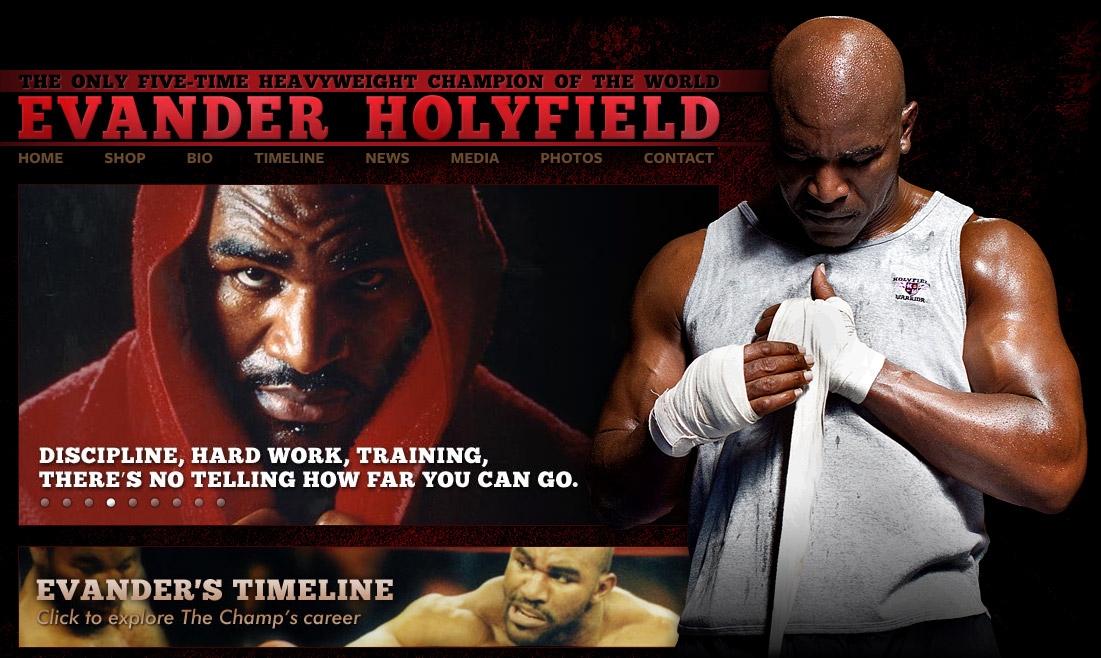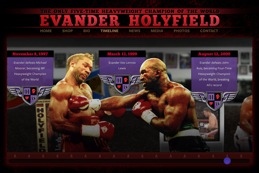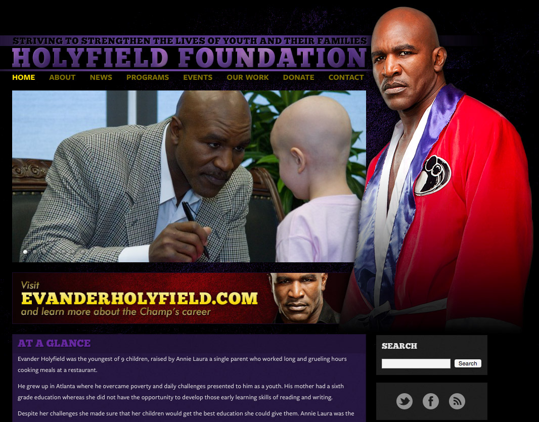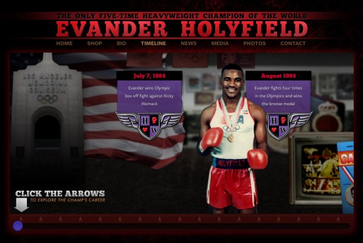 Official website for heavyweight champ Evander Holyfield. Includes a scrolling parallax timeline (non‑Flash!) highlighting key moments in his career. We also created a side site for Evander’s foundation, which has a similar style.